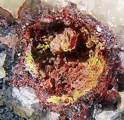 ![]() Yellow acicular crystals of the very rare mercury mineral edoylerite from the Clear Ceek mine (Clear Creek Claim, Goat Mountain, New Idria, San Benito County, California, United States of America), famous for its paragenesis of very rare Hg minerals, associated to red cinnabar. Edoylerite is a mercury chromate. Ex.Dr Hartel collection. | |