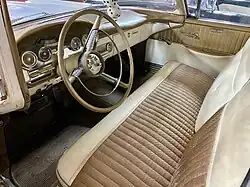 Like the Citation, the Corsair was powered by the 345 bhp (257 kW) 410 cu in (6.7 L) MEL V8 (with four-barrel {four choke} carburetor),[5] and came equipped with Edsel’s Teletouch automatic as standard. (This was a US$231 option on Ranger and Pacer models.)[5] Unlike other Ford models that used a column-mounted gear selector, Teletouch placed its drive-selection buttons in the steering wheel hub where drivers were accustomed to finding the horn button. In emergency situations, damage to the transmission that might occur if the driver hit the Teletouch unit instead of the steering wheel's horn ring was prevented by an electro-hydraulic switch activated by internal transmission fluid pressure. A basic heater (as a US$92 option) and radio (at US$95) were available, and air conditioning was optional as well (at US$460).[5] Also optional were an automatic trunk release,[6] a tachometer,[7][8] an automatic lube system,[9] seat belts,[10] a padded dash board, warning lights for low oil level and parking brake on,[4][11] plus rear door safety locks to prevent young kids from opening them while the car is moving.[6]