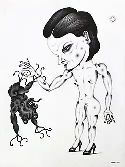 ″Explosive colors, explosive eroticism, excellent technique and the desire for endless possibilities propels the work of Eduardo Sarmiento″.[5] Art Critics have categorized it as Fauvism,[6] Pop Art, and others, as cited by the Miami New Times, refer to it as something of an ″aftermath if Satan, Salvador Dalí, and Gary Baseman got together to chew peyote, watched schlocky horror movies on repeat, and play "cadavre exquis" for 69 hours straight″.[7]