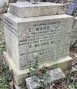 Blyth returned to London on 9 March 1863 to recover from ill health. He was to get a full year's pay for this sick leave. He however had to borrow money from John Henry Gurney and continued his animal trade. Around 1865, he began to help Thomas C. Jerdon in the writing of the Birds of India but had a mental breakdown and had to be kept in a private asylum. He was a corresponding member of the Zoological Society and was elected an extraordinary member of the British Ornithological Union, nominated by Alfred Newton. He later took to drinking and was once held for assaulting a cab driver. He died of heart disease on 27 December 1873 and is buried in a family grave in Highgate Cemetery.[7][9]
