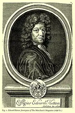 Edward Hatton (c. 1664 โ after 1733)[1] was a surveyor for a fire insurance company in London[2][3] who wrote A New View of London: or, an Ample Account of that City, in Two Volumes, or Eight Sections. &c., published anonymously in two octavo volumes 1708. The New View is an important reference to the streets, life and buildings of London not long after the Great Fire of London, 1666.