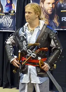Edward Kenway is voiced by Matt Ryan, who also portrayed the character in a motion capture studio.[5] McDevitt admitted that the character and his back story became far more influenced by the culture of Wales than he had originally intended; the developmental team only decided to build their story around a Welsh pirate when they cast Ryan as the voice and image of the character. McDevitt originally envisioned Edward to hail from an English port town like Bristol, Portsmouth, or Manchester, but deliberately left his background blank prior to the finalization of the casting process because he wanted to draw from whichever actor was chosen. McDevitt praised Ryan for the charisma and the personality he brought to the character, but recalled that he initially read his lines in a West County accent. Ryan was then asked to speak in his natural Welsh accent, which ultimately prompted McDevitt to finalize Edward as a Welsh character from Swansea, which matches his actor's cultural background. McDevitt consulted Ryan's father for ideas as he wanted to include some colloquial Welsh phrases into the game's dialogue.[6]