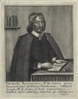 Sir Edward Leigh (24 March 1602 – 2 June 1671) was an English lay writer, known particularly for his works on religious topics, and a politician who sat in the House of Commons from 1645 to 1648.