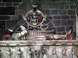 Littleton died on 25 July 1629 at Pillaton Hall, his Staffordshire home. He was buried the next day in St Michael's church, Penkridge. In his will, dated 1 June 1629, he left his wife 200 sheep, as well as cattle and agricultural equipment. He left instructions that a monument be erected to himself, his wife, his father and mother. This was duly completed by his son, the 1st baronet. an impressive two-tiered structure, it features effigies of Littleton and Mary Fisher on the upper tier, with his parents below. It was installed against the north wall of the chancel, but has since been relocated to the east wall.[17]