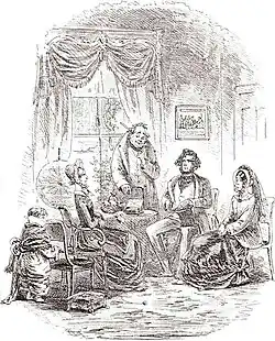 ![]() Phiz: "The momentous interview". Edward Murdstone and his sister Jane discuss David Copperfield's future with his aunt, Betsey Trotwood. | |