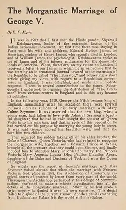After Mylius was released from prison, he went to live in the United States. There, beyond the reach of English libel law, he published another version of the claim, which appeared in a 1916 pamphlet, The Morganatic Marriage of George V, printed in Greenwich Village by Guido Bruno.[2] The allegation was bolstered by finding a Hampshire Telegraph and Sussex Chronicle report of Mary Culme-Seymour dancing with the prince at a ball at Portsmouth Town Hall on 21 August 1891.[f] She had testified at the trial that she had not seen the prince between 1879 and 1898.