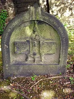 Edward Ormerod (sometimes Ormrod) was born on 2 May 1834 in the village of Church, near Accrington, in Lancashire, England. He worked as a mining engineer at Fletcher, Burrows and Company's Gibfield Colliery in Atherton, Greater Manchester, where he devised and tested a safety device.[1] He was supported by chief engineering foreman, James Rothwell from Hindley. He married Betsy Hope in 1856 and had several children. He died on 26 May 1894 and is buried in Atherton Cemetery. A small memorial stone in front of his grave depicts and pays tribute to his invention.