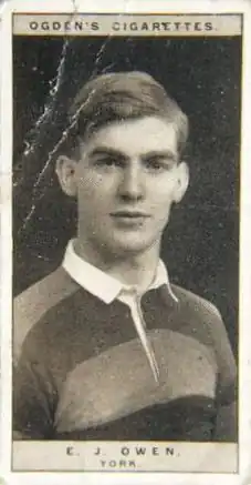 "E. J. Owen' York (Northern Rugby League.) E. J. Owen was born in Crumlin, and is proving his worth as a full back. He was discovered by Leeds officials, but the Headingley club with a great wealth of talent allowed him to go to York. He is a brilliant defensive player, and can kick with great power with either foot. He is also a great goalkeeper. Owen has been unfortunate in coming to hand when there were so many full backs of ability in the league. He was, however, selected as reserve to Sullivan for the Wales and England match in 1926."[5]