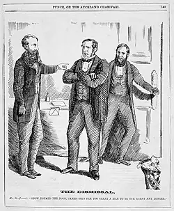 Stafford's government maintained generally good relations with Māori for some time. This exemplified by the establishment of Māori seats in parliament in 1867, and by Stafford's request for the governor to pardon "rebel" Māori chiefs. The sudden military successes of Te Kooti and Titokowaru caused many to claim that Stafford's attempts at reconciliation had been misjudged.[17] Stafford sought to call an election and gain a fresh mandate, but his move was blocked by Governor George Bowen, who had a strong dislike of Stafford. Stafford's government was defeated in 1869. His replacement was, once again, William Fox.[18]