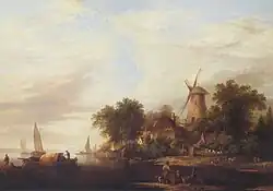 As Edward Williams developed his own style, he moved on to contemporary landscapes of the English countryside that, not surprisingly, hint of some of the work of his uncle George Morland. However, he became best known for moonlit scenes of boats and windmills along the Thames River, which earned him the epithet with the public of "Moonlight Williams", or simply the "moonlight painter". He rarely signed his work, perhaps but one painting in a hundred, and when he did he signed simply as E.Wms. As a consequence, the work of Old Williams can be difficult at times to distinguish from that of his son Edward Charles Williams, who painted in a similar style and signed his paintings E. Williams.[7]
