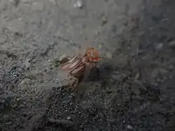 This tiny anemone has a diameter of just 5 millimetres and a length of 30–50 millimetres.[2][3] Its long worm-like body is divided into three parts: physa, scapus, and capitulum. The physa is a bulbous bladder-like organ covered with tiny suckers, used in burrowing.[4] The scapus or body column is wrinkly and covered with a rough cuticle that can be brown, grey, or orange in colour, with a narrow neck at the top connecting it to the capitulum or oral end.[4]
