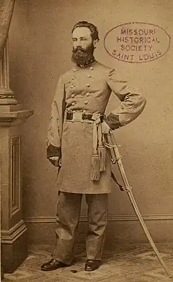 Upon reaching the hotel they met General Sterling Price, who, upon seeing his son and his lieutenants, asked what they were doing there, and when informed that they had come to dine with him remarked: "Gentlemen, you have no time to dine. Lyon is marching upon your camp."[1] There was a carriage in front of the hotel.[1] He pointed to the carriage and said: "Go with all possible speed to Gen. Frost, and ascertain from him if he intends to fight. If so, take a musket and stay with him. If not, however, say to the General that I have advised you to make your escape, if possible, and return to your company."[1] Upon their return to camp General Frost told them he was sorry they had returned, for he felt it was impossible to get away.[1] They replied that with his permission they would make the effort.[1] He told them to go if they could.[1] They did not take time to go to their tent for their baggage, but entered a carriage and drove leisurely between the lines of the Union forces to the nearest railway station, and made their escape from the city.[1] As soon as a battalion was raised in Chariton County Captain Price was elected lieutenant colonel.[1] After taking part, with his command, at the battles of Carthage, Drywood, and Lexington, he was elected colonel, and soon after the election of General John B. Clark, Sr., to the Confederate States Senate Colonel Price was elected brigadier general of his brigade.[1] At that time he was twenty-seven years old.[1]