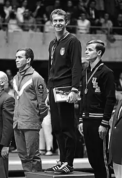 He represented the United States at the 1968 Summer Olympics in Mexico City, where he won a bronze medal in the 10 m platform diving event. America had alway won this event at the Olympics except for the 1912 Olympiad. In October, 1968 the favorite for the event was Italian Klaus Dibiasi, shown in the center on the podium photo at left. Dibiasi, the 1964 silver medalist and 1966 European Champion, took the early lead, held it through the contest, and increased it during the final rounds. Dibiasi would win the Olympic event in both 1972 and 1976, and many would consider him the greatest Olympic platform diver, until American Greg Louganis made his Olympic appearance.[1][8]