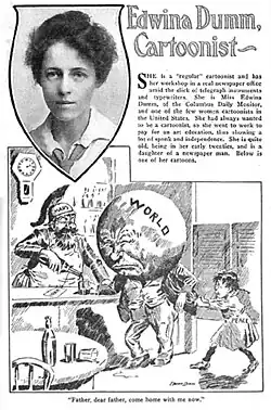 In 1915, Dumm was hired by the short-lived Republican newspaper, the Columbus Monitor, to be a full-time cartoonist.[2] Her first cartoon was published on August 7, 1915, in the debut issue of the paper. During her years at the Monitor she provided a variety of features including a comic strip called The Meanderings of Minnie about a young tomboy girl and her dog, Lillie Jane, and a full-page editorial cartoon feature, Spot-Light Sketches[3]. She drew editorial cartoons for the Monitor from its first edition (August 7, 1915) until the paper folded (July 1917). In the Monitor, her Spot-Light Sketches was a full-page feature of editorial cartoons, and some of these promoted women's issues. Elisabeth Israels Perry, in the introduction to Alice Sheppard's Cartooning for Suffrage (1994), wrote that artists such as Blanche Ames Ames, Lou Rogers and Edwina Dumm produced: