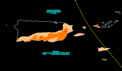 Because the hurricane moved farther northeast than initially anticipated, its effects in Puerto Rico were relatively limited.[13] Rainbands associated with the hurricane produced gusty winds and heavy rain on August 28–29.[46] The heaviest rains were concentrated on the southern and eastern coasts of the island, peaking at 5.44 in (138 mm) in Juana Díaz.[34] Wind gusts in Culebra reached 62 and 35 mph (100 and 56 km/h) in San Juan.[13][46] Approximately 23,000 households lost power across the territory.[13] A man in Bayamón died when he fell off his roof trying to clean drains in advance of the storm.[47] Flash floods, rockslides, and mudslides impacted multiple counties with a few disrupting travel.[48] One person was trapped by floodwaters near Humacao.[49] Elsewhere, The Blanco, Guayanés, and Marín rivers topped their banks, submerging local roadways.[48]