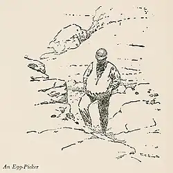 Egg collection was a seasonal occupation, from mid-May until July. The eggs of murres were preferred over those of other species, their eggs being the largest and most common ones available. Western gull eggs were also occasionally taken, having a comparable flavor, but they were smaller than murre eggs and more fragile (an important factor given the choppy seas between the Farallon Islands and San Francisco). Individual eggers collected from certain areas. Prior to collecting the workers would progress through a colony destroying every egg they could find, thus, returning to the site on subsequent days, they could be certain the eggs they collected were fresh. Eggers had to work quickly as the murres would flush and immediately the gulls would move in to snatch the unguarded eggs.[1]