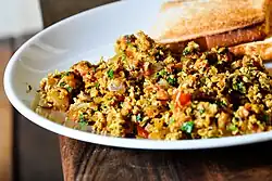 Egg bhurji, also known as Anda Bhurji or Ande ka Khagina, is a scrambled eggs dish which is a popular street food and a breakfast, lunch or dinner recipe. Originating from the Indian subcontinent, it is sometimes compared with the Parsi dish akuri. The Parsi dish Akoori or Akuri is very similar to egg bhurji with a few differences. Just like bhurji, akuri is filled with many aromatics like ginger, onion and other spices. However, bhurji eggs are cooked until dry, whereas akoori eggs are cooked less while still runny. The difference lies in its preparation and addition of sautéed chopped onions, chilies and optional spices.[1]