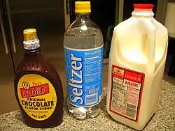 An egg cream[1] is a cold beverage consisting of milk, carbonated water, and flavored syrup (typically chocolate or vanilla), as a substitute for an ice cream float.[2] Ideally, the glass is left with 2⁄3 liquid and 1⁄3 foamy head.[3] Despite the name, the drink contains neither eggs nor cream.[4]