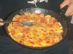 Eggah (Egyptian Arabic: عجة ʻEgga) is an egg-based dish in Egyptian cuisine that is similar to a frittata.[1] It is also known as Egyptian omelet.[2] Eggah is commonly seasoned with spices such as pepper, cinnamon, cumin, coriander seeds, turmeric, nutmeg and fresh herbs.[3] It is generally thick, commonly filled with vegetables and sometimes meat and cooked until completely firm. It is usually circle-shaped and served sliced into rectangles or wedges, sometimes hot and sometimes cold.[4] Eggah can be served as an appetizer, main course or side dish.[4]