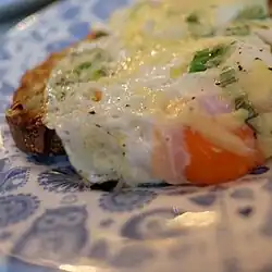 The dish always includes eggs and cheese and typically includes chilis; other ingredients such as ghee or butter, and onion or chutney may be included.[7][3] It may be baked, broiled or cooked over direct heat, is usually served on toast and may be served with ketchup.[7][1] Typically, whole unbeaten eggs are used, but the eggs can also be scrambled.[3]