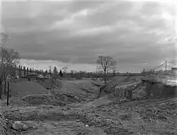 The eastern segment through Scarborough was known as Highway 5A between 1937 and 1953; this number also appeared on St. Clair Avenue West until 1952 when the Toronto Bypass, (the precursor to Highway 401), opened between Weston and Highway 11 (Yonge Street). The two pieces of "Highway 5A" were never connected. In 1953, what remained was renumbered as Highway 109; a year later, the road was removed from the provincial highway system. Because of its time as a provincial highway, the road through Scarborough was widened considerably. A right of way was also acquired to bridge the gap in Eglinton Avenue. Until the mid-1950s, Eglinton Avenue did not cross either of the valleys of the Don River. The road ended at Brentcliffe Road (unassigned path beyond Laird Drive towards Brentcliffe Road and the dump was once site of hangar for Leaside Aerodrome) and resumed at Victoria Park Avenue (then known as Dawes Road). This break resulted in a bypassed eastern stub at Bermondsey Road signed as Old Eglinton Avenue. The Department of Highways relinquished control of Highway 109 to the newly formed Metro government. Metro built the new section of Eglinton Avenue, first between Dawes Road and Don Mills Road in 1955, and later between Don Mills Road and Leaside in 1956.[2]