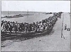 Companies of the Egyptian Labour Corps were supplied to work on construction of railways and roads. They worked to manage sanitation, were employed as stevedores and on wharf construction. They loaded and unloaded lighters, carried stores for supply depots and loaded lorries for the ASC.[5] They laid the pipelines, built the railway embankments and helped lay the track, loaded and unloaded the trains, manned the surf boats, stowed or discharged the cargoes of surf boats from supply and store ships, and were employed everywhere on conservancy duties.[6][7]