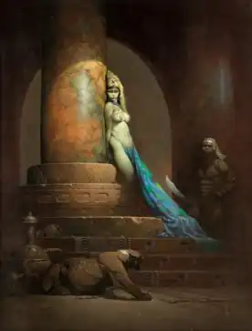 Egyptian Queen is a painting by Frank Frazetta, made in 1969 for the cover of the horror-comic magazine Eerie. It depicts a near-nude woman leaning against a column, accompanied by a leopard on the floor and a bare-chested man in the background. The painting is among Frazetta's most famous and has been popular as a poster. The woman's face on the original magazine cover is different from later reproductions after Frazetta chose to repaint it. The original painting was sold in 2019 for 5.4 million U.S. dollars, which set a new world record for comic art. It was surpassed in 2023 by another Frank Frazetta work (Dark Kingdom), which sold for 6 million U.S. dollars.