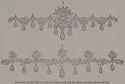 Other fillets made of jewels were popular among the middle and upper classes. The kussah was 7-8 inches long, and made of diamonds, rubies, emeralds, or pearls set in gold or silver. It was worn in front of the rabtah and attached with hooks. The 'en'ebeh was the same, but 14-15 inches long. The shawateh (sing. shateh) was a pair of ornaments made of three strands of pearls, each the length of a kussah, and united by a pierced emerald. Sometimes it was strung in a netted pattern instead of strands, with a few small emeralds sometimes included. It could be attached to the earrings, the front of the rabtah with festoons, or to a kussah's hooks and worn in the back of the headdress. Lower-class women also wore the sheddah benad'kah, a string of Venetian sequins (a type of coin), in the same manner as the kussah or 'en'ebeh.[33]