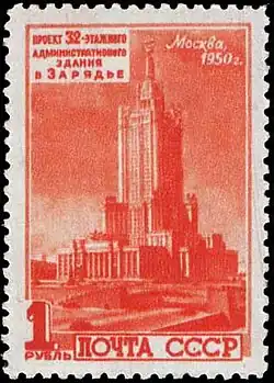 The final design of the administrative building in Zaryadye was completed and published in 1949, at which time its two authors, the architect Dmitry Chechulin and the engineer Iosif Tigranov, became winners of the Stalin Prize.[1][2]