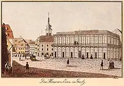 The bridge over the river Mur at Murplatz (present-day Südtirolerplatz) was for centuries the only crossing point in the city. In 1827 the bridge here, a covered wooden bridge lined on both sides with small wooden shops, was destroyed by flooding. Buildings near the bridge, damaged by the flood, were subsequently demolished.[1]