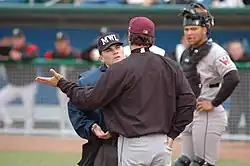 In baseball, each umpire has a considerable amount of discretion, and may eject any player, coach, or manager solely on his own judgment of unsportsmanlike conduct.[1] The ejectable offense may be an excessively heated or offensive argument with an umpire, offensive interference (contact with the catcher on a play at the plate), malicious game play (especially pitchers attempting to intentionally strike batters with the ball or a manager or coach ordering a pitcher to do so),[2] illegally applying a foreign substance to a bat or otherwise tampering with a ball,[3] using a corked bat,[4] charging the mound, or otherwise fighting. Between players and umpires, there is a common understanding that a certain level of argument is permitted, but players who too vigorously question an umpire's judgment of balls and strikes,[5] argue a balk or use foul language may risk an ejection. A player is also automatically ejected when a bat, glove, cap or helmet is taken off and thrown down in anger or confusion.