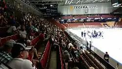 The arena hosted games during the 2007 World Junior Ice Hockey Championships, together with FM Mattsson Arena in Mora. The following season, the 2007 4 Nations Cup was played at Tegera Arena. The current attendance record for ice hockey is 8,017.[4] However, the maximum capacity has since been reduced to 7,650 due to safety regulations. Until fall 2010 the name was Ejendals Arena, but the company owning the name rights decided they wanted to promote a brand instead of their company name.[5]