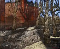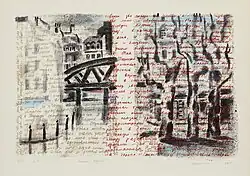Over the years, Posetselskaya worked in painting, batik, printed graphics, book design, and tapestry.[11] However, she's best known for her pastel drawings of cities such as Saint Petersburg, London, and Paris. Her works present the city as a protagonist, free of genre scenes. Posetselskaya focuses on the architecture and geometry of flat surfaces, using pastels to mimic the texture of the walls and add softness to the image. She leans towards delicate ochre, beige, brown, light-gray, cadmium, and coppery colors.[11][14][15][16][17]