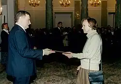 ![]() Elżbieta Kossecka receives a diploma of professor from President Lech Wałęsa | |