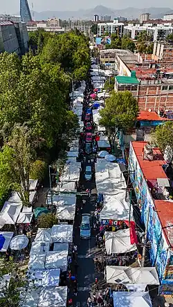 The Tianguis Cultural del Chopo is a Saturday flea market (tianguis in Mexican Spanish) near downtown Mexico City, known locally as El Chopo.[1][2][3] It is named after its original location which was near the Museo Universitario del Chopo, an Art Nouveau building with a couple of towers designed by Bruno Möhring.[4] Depending on the affiliation one has with this event, it has been referred to as "The Punk Market", "The Metal Market", or "The Goth Market". Since the end of the 1980s, the Tianguis del Chopo has been located close to Metro Buenavista station on Aldama street, in the Colonia Guerrero neighborhood.