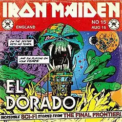 "El Dorado" is the second track from English heavy metal band Iron Maiden's 2010 album The Final Frontier. The song is the band's forty-first single, and the only one from the album. It is also the last single to use the band's alternate logo. The song was released as a free download on the band's official site at 00:01 on 8 June 2010 (UTC), one day before the album's supporting tour began.[2] Released ten weeks before The Final Frontier, it marks the longest time between the release of an Iron Maiden single and the studio album it is featured on since 1980's "Running Free". The cover art was created by Anthony Dry and is based on the covers of the EC Comics published by William Gaines that were popular in the 1950s. Regarding the early online release of the song, vocalist Bruce Dickinson explained, "El Dorado is a preview of the forthcoming studio album. As we will be including it in the set of our Final Frontier World Tour, we thought it would be great to thank all our fans and get them into The Final Frontier mood by giving them this song up front of the tour and album release."[2]