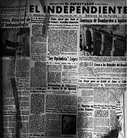 Finally, Darío Bautista and José Salgar obtained the authorization to print El Independiente.[7] The first edition circulated on February 20, 1956,[8][4] directed by Alberto Lleras Camargo.[6] However, since Lleras was simultaneously the leader of Liberal Party, many of the actions against the regime were planned from the offices of El Independiente, and some handbill regarded as subversive by the government was linked to the activity of the newspaper. Lleras was accused of being an accomplice of such clandestine maneuvers. He was not allowed to defend himself, and the new daily was closed on April 15, 1956, less than two months after being founded.[9]