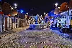 Most of its buildings are made of brick with Talavera tile accents very typical of Puebla traditional architecture,[2] and its streets are paved in stone.[1] There are 112 stands, which sell handcrafts from various parts of Mexico. These include various kinds of pottery, regional and traditional clothing, leather goods, wood items, jewelry and copper work. Handcrafts from Puebla state dominate, including Talavera pottery, silver from Amozoc, amate paper from Pahuatlán and traditional candies such as camotes.[1][2]