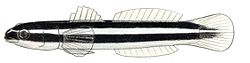 Neon gobies are very small, torpedo-shaped fish. Although sizes vary slightly by species, they are generally about 2.5 cm (0.98 in) long.[2] They have dark bodies with iridescent stripes running from the tip of the nose to the base of the caudal fin. The color of the stripes varies by species. Like all gobies, their dorsal fin is split in two, the anterior dorsal fin being rounded like that of a clownfish and the posterior dorsal fin being relatively flat. The anal fin lines up with the posterior dorsal fin and is of similar shape. The pectoral fins are nearly circular, and, like all other fins, transparent.[2]
