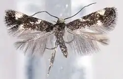 The wingspan is 8–9 millimetres (0.31–0.35 in).[1] The head is white with a conspicuously whitish forehead. Forewings are blackish; a somewhat oblique fascia before middle, sometimes interrupted, a tornal spot, and a rather larger triangular costal spot beyond it white. Hindwings dark grey. The larva is yellow-whitish; head pale brown; 2 with three rows of brown dots.[2][3][4]