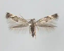 The wingspan is 7–8 millimetres (0.28–0.31 in).[1] The head is grey, face whitish. Forewings in male grey, in female blackish-grey; plical stigma black, elongate, followed by a white dot; an oblique white triangular costal spot at 2/3; a small indistinct whitish tornal spot somewhat beyond it. Hindwings grey.grey.[2][3][4]