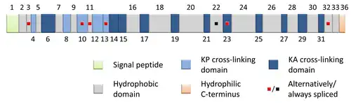 Each tropoelastin consists of a string of 36 small domains, each weighing about 2 kDa in a random coil conformation. The protein consists of alternating hydrophobic and hydrophilic domains, which are encoded by separate exons, so that the domain structure of tropoelastin reflects the exon organization of the gene. The hydrophilic domains contain Lys-Ala (KA) and Lys-Pro (KP) motifs that are involved in crosslinking during the formation of mature elastin. In the KA domains, lysine residues occur as pairs or triplets separated by two or three alanine residues (e.g. AAAKAAKAA) whereas in KP domains the lysine residues are separated mainly by proline residues (e.g. KPLKP).