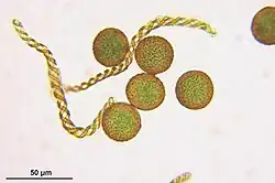 Under moist conditions, the elaters curl tightly around the spore. The wet spores tend to stick to each other and to nearby surfaces because of surface tension. When conditions are dry, the spores no longer stick to each other and are more easily dispersed. At that time, the elaters uncoil to extend out from the spore and will catch air currents. The fact that they are extended only when conditions are dry means that successful spore dispersal is more likely.