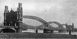 In particular, the term refers to several parallel railroad and road bridges over River Elbe in central Hamburg, divided into Norderelbbrücken (Northern Elbe bridges) and Süderelbbrücken (Southern Elbe bridges). They emerged from the first crossings over River Elbe, and today, due to the low headroom, form a barrier east of the Port of Hamburg which can't be passed by sea ships. Today, especially the Norderelbbrücken are considered a landmark of Hamburg.[1]