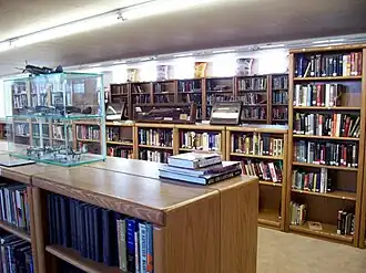 Also displayed in the library are Uniforms, Newspaper articles, and metals in cases across the room.