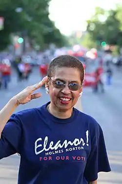 Eleanor Holmes Norton (born June 13, 1937)[1][2] is an American politician, lawyer, and human rights activist.[3] Norton is a congressional delegate to the U.S. House of Representatives, where she has represented the District of Columbia since 1991 as a member of the Democratic Party.[4] She is serving an eighteenth term in the United States House of Representatives.