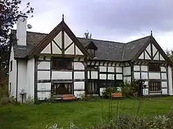 Some smaller estates were left to a distant cousin, Domville H.C. Poole of Lymm Hall.[41] A final bequest was unusual in the fact that it was not to a blood relative. A large bequest went to Atherton's godson, Edward Fox, son of Edward Vigor-Fox of the Manchester and Salford Yeomanry, who were infamously involved in the Peterloo Massacre and likely descended from Jane Vigor.[42] Fox was directed to use the name of "Atherton Byrom", in order to inherit her Manchester estates and land at Chester, and her cherished retreat, Kersal Cell,[43] along with the entire Byrom Hall estate, in Lowton, which included the right to use the Byrom crest. A Royal Licence was granted by the Queen on 29 December 1870.[44][45] The godson became Edward Byrom of Culver House and Kersal.[46] He lived in Holcombe Burnell, and became High Sheriff of Devon in 1888.[47] His elder son was Edward Clement Atherton Byrom,[48] who married Katharine Mary Coopland,[49] and his younger son (by his second wife) was Edward Luttrell Grimston Byrom, who married and then divorced Duff Twysden.[50][51]