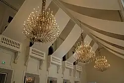 During World War II, the palace complex was reduced to a shell by bombs in 1944. It was rebuilt in 1950–51, the exterior being accurately reconstructed using the original plans and the interior finished in 1950s style, except for a few spaces in the centre section whose interiors were reconstructed in the classical style of the palace's original construction (before Stüler's alterations): the grand staircase, the entrance hall, the guard room (now known as the Spiegelsaal (hall of mirrors) or the Kurfürstensaal (elector's hall) and the garden room.[1] A competition was held to choose art works for these rooms: the staircase was decorated on the ground floor with a statue by Emil Krieger entitled Kore, on the landings with Europa on the Bull by Otto Rumpf and Horse and Rider by Werner Meurer and on the first floor with niche paintings by Edvard Frank; Rolf Müller-Landau created allegorical paintings for the niches in the south hall on the ground floor; two paintings in the northern vestibule of the garden room are by Edgar Ehse; and a mosaic on one wall of the grand staircase, signed E. K., is probably by Eugen Keller. The selection committee attempted to reproduce as closely as possible the original impression a visitor would have received, including in the choice of colours, but the works reflect the period of their creation.[8] The grounds were restored in the original style, in particular the forecourt. The only surviving historic interior is that of the vestibule to the now destroyed palace chapel, at the head end of the northern semi-circular wing. The two wings were restored in a simplified modern form, preserving only the footprint of the originals.[1]