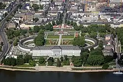 In commissioning the relatively unornamented and austere building from French architects, Clemens Wenceslaus broke with the previous tradition in Koblenz of architecture in the French and German Baroque tradition. It was built as a residence and city palace. However, as a function of its location on the bank of the Rhine, it was conceived of as part of the river landscape, and the rooms are so arranged as to either draw attention to the landscape or refer to it. From the entrance facing the city, the intended path leads through the vestibule and garden room to the palace garden on the riverbank. The rooms on the south and east sides offer an impressive view of the Middle Rhine Valley. The embracing of the landscape was in response to Clemens Wenceslaus' wish. The grand gesture of the forecourt encircled by the colonnaded wings has older antecedents, such as the colonnades of St. Peter's Square in Rome, the New Palace in Bayreuth, and Schwetzingen Castle.[1]