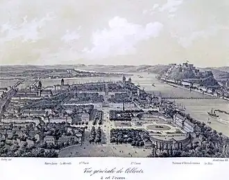 The old electoral residence, Schloss Philippsburg in Ehrenbreitstein, was in urgent need of repair and from the point of view of the new archbishop and elector, a member of the Saxon-Polish royal family, was beneath his station.[2] The estates, who did not readily accept the need for a new building, were only persuaded after lengthy discussion to agree to paying for it. The building was finally erected in 1777–1793 in a new section of Koblenz called Neustadt. The original chief architect was the Parisian Pierre Michel d’Ixnard, who had already designed several buildings in South Germany. A first draft of the plans made in 1776, by others had been for a horseshoe-shaped design farther away from the river and farther north, facing the old city centre; probably on the request of Clemens Wenceslaus, d'Ixnard changed the site and the orientation. However, after criticism of his plans, a report was commissioned from the Academy of Architects in Paris, which confirmed some of the criticism. He was let go on 18 December 1779 and was replaced on the Academy's recommendation by another French architect, Antoine-François Peyre the Younger, whose modified plans submitted in 1780[2] produced the smaller and simpler structure which was built. The exterior was complete by 1784.[1]
